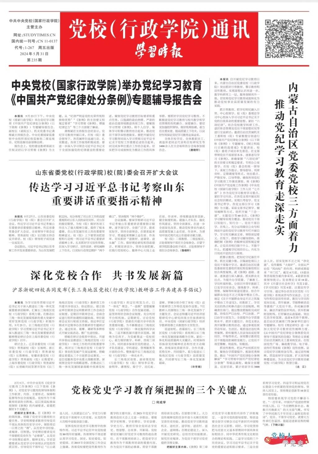 5月31日,学习时报发表《内蒙古自治区党委党校三方面着力推动党纪学习教育走深走实》通讯文章。