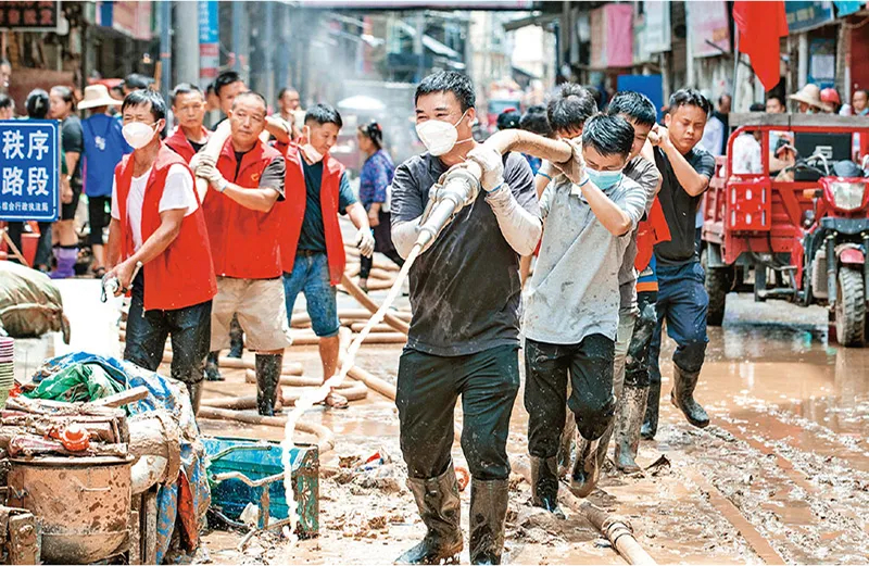 敢于担当作为是中国共产党人一以贯之的优秀品质。图为2025年6月30日,在贵州省从江县丙梅街道俞家湾社区,党员志愿者在参与清淤工作。 人民图片 罗京来/摄