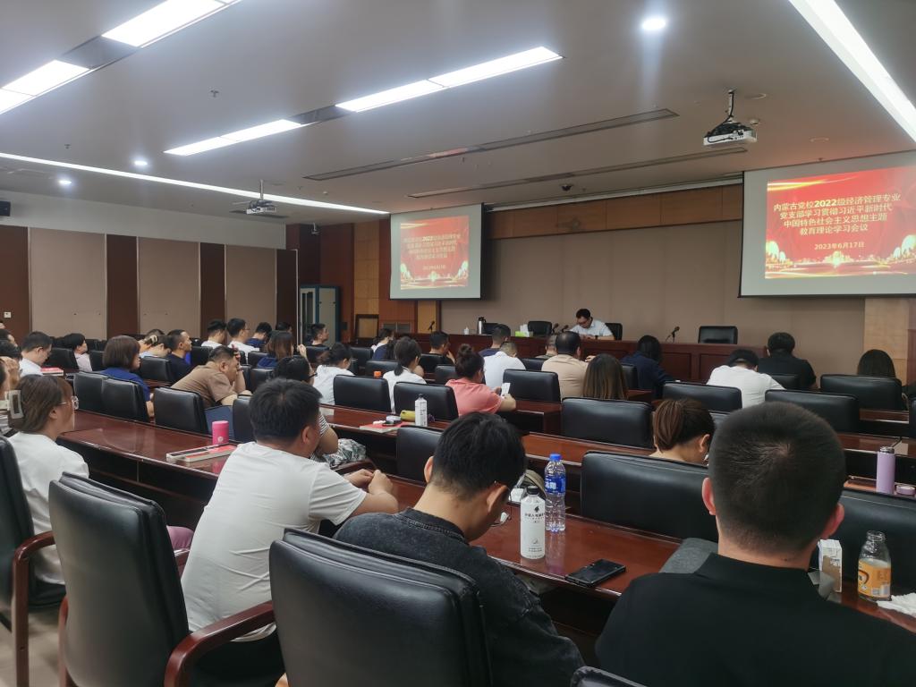 6月17日,内蒙古党校2022级经济管理专业学员临时党支部召开理论学习会议,学习习近平总书记在内蒙古考察期间的重要讲话重要指示精神,并围绕如何推动习近平新时代中国特色社会主义思想主题教育走深走实进行交流研讨。班主任海力思主持集体学习,支部副书记高海斌就主题教育重点内容、根本任务进行专题解读,全体学员参加学习。